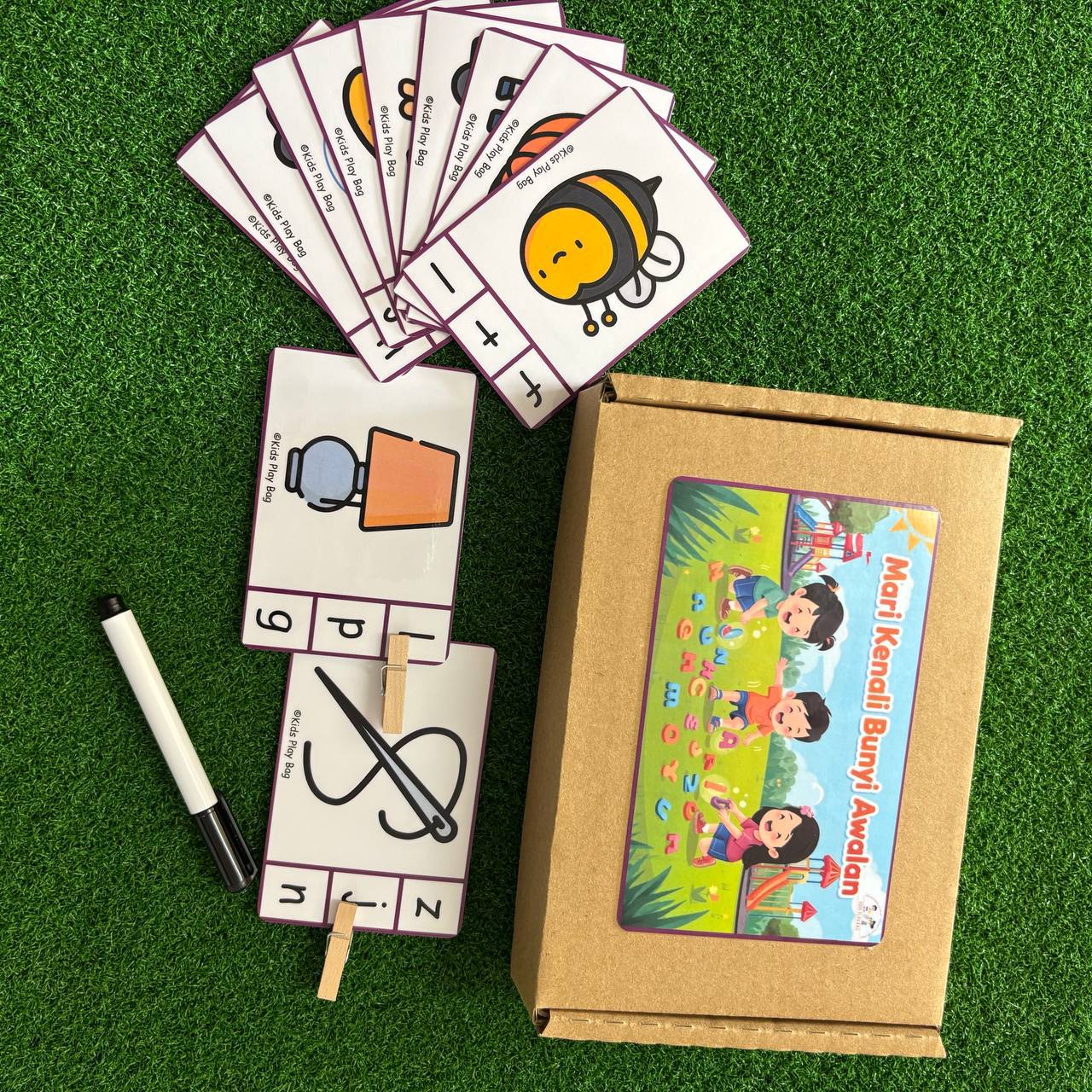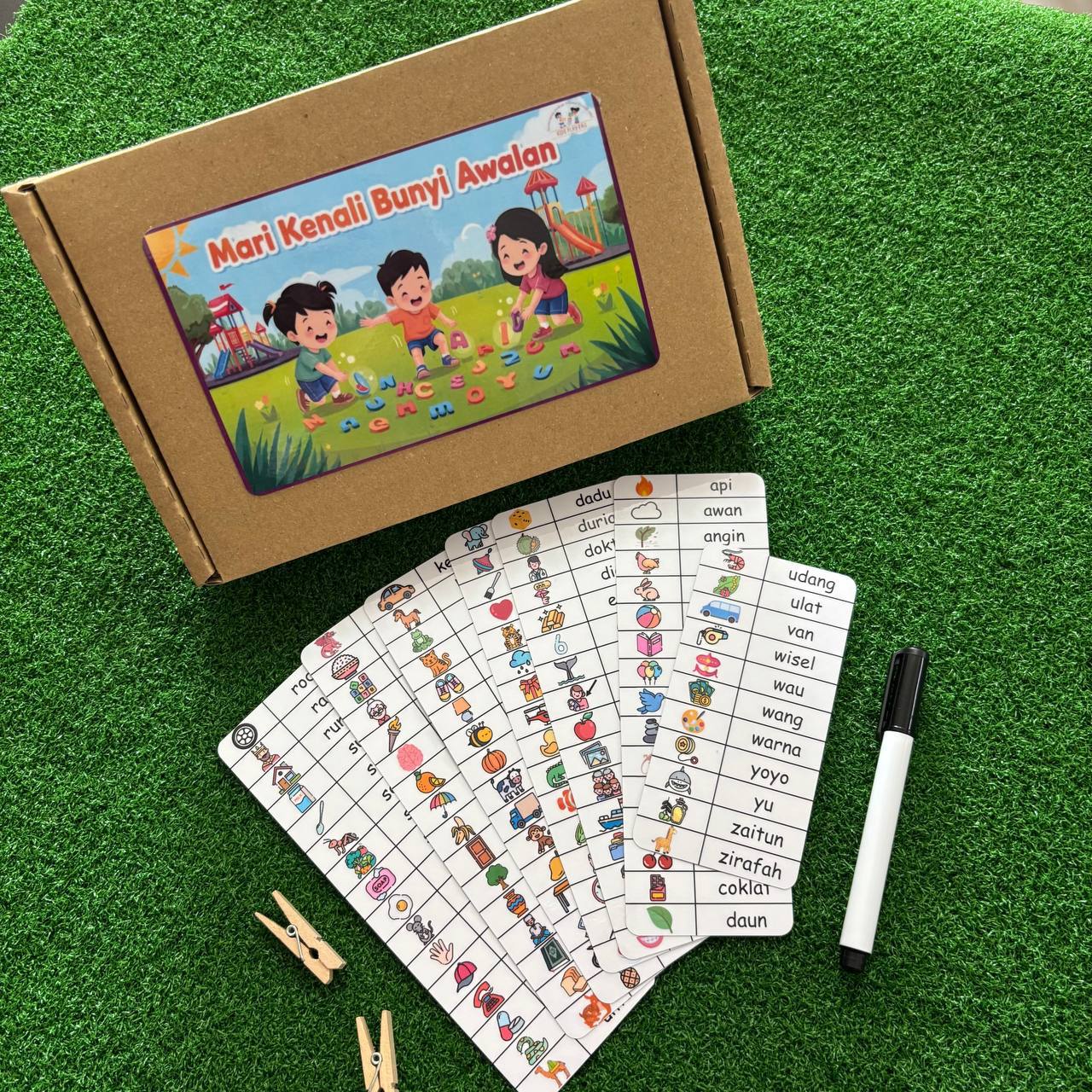 Mari Kenali Bunyi Awalan is a hands-on activity where children match pictures to their beginning sounds in Malay. Each activity card encourages children to think, listen, and connect meaning to words.